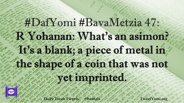 #DafYomi #BavaMetzia 47: R Yohanan: What’s an asimon? It’s a blank; a piece of metal in the shape of a coin that was not yet imprinted.