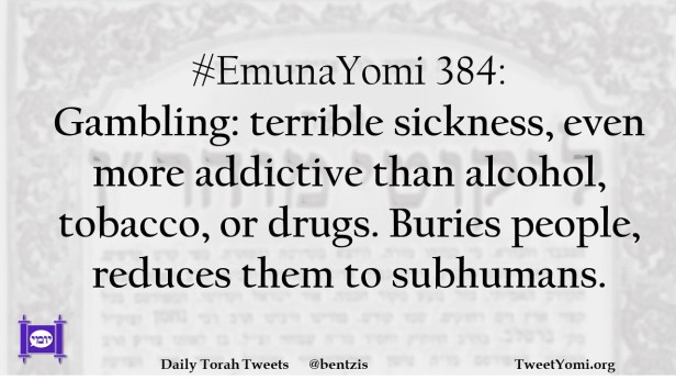 #EmunaYomi 384: Gambling: terrible sickness, even more addictive than alcohol, tobacco, or drugs. Buries people, reduces them to subhumans.