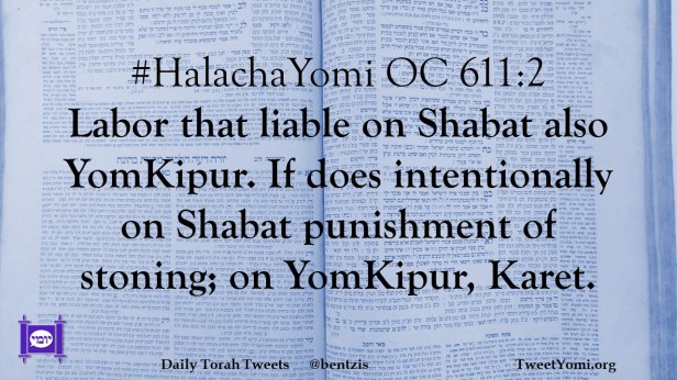 #HalachaYomi OC 611:2 Labor that liable on Shabat also YomKipur. If does intentionally on Shabat punishment of stoning; on YomKipur, Karet.