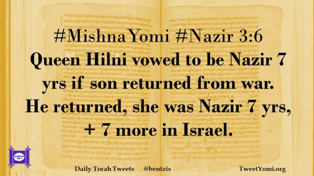 #MishnaYomi #Nazir 3:6 Queen Hilni vowed to be Nazir 7 yrs if son returned from war. He returned, she was Nazir 7 yrs, + 7 more in Israel.