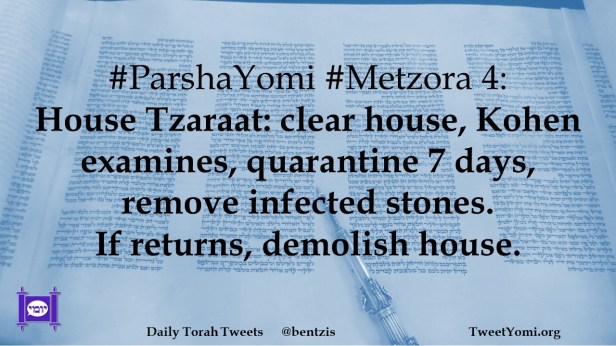 #ParshaYomi #Metzora 4: House Tzaraat: clear house, Kohen examines, quarantine 7 days, remove infected stones. If returns, demolish house.