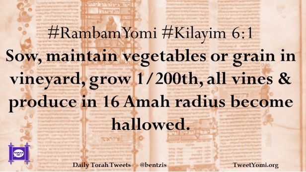 #RambamYomi #Kilayim 6:1 Sow, maintain vegetables or grain in vineyard, grow 1/200th, all vines & produce in 16 Amah radius become hallowed.