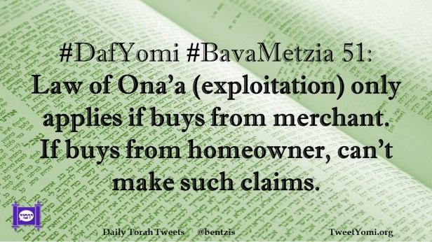 #DafYomi #BavaMetzia 51: Law of Ona’a (exploitation) only applies if buys from merchant. If buys from homeowner, can’t make such claims.