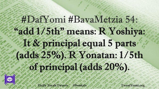#DafYomi #BavaMetzia 54: “add 1/5th” means: R Yoshiya: It & principal equal 5 parts (adds 25%). R Yonatan: 1/5th of principal (adds 20%).