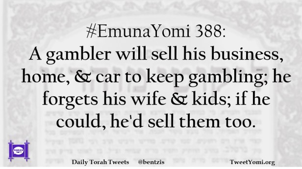 #EmunaYomi 388: A gambler will sell his business, home, & car to keep gambling; he forgets his wife & kids; if he could, he’d sell them too.