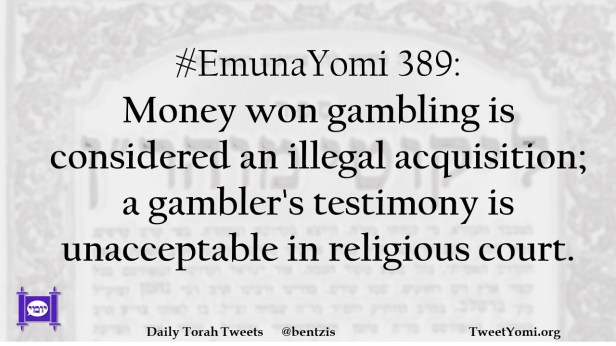 #EmunaYomi 389: Money won gambling is considered an illegal acquisition; a gambler’s testimony is unacceptable in religious court.