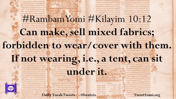 #RambamYomi #Kilayim 10:12 Can make, sell mixed fabrics; forbidden to wear/cover with them. If not wearing, i.e., a tent, can sit under it.