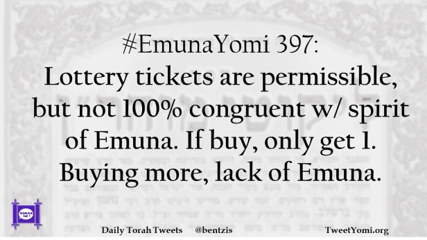 #EmunaYomi 397: Lottery tickets are permissible, but not 100% congruent w/ spirit of Emuna. If buy, only get 1. Buying more, lack of Emuna.