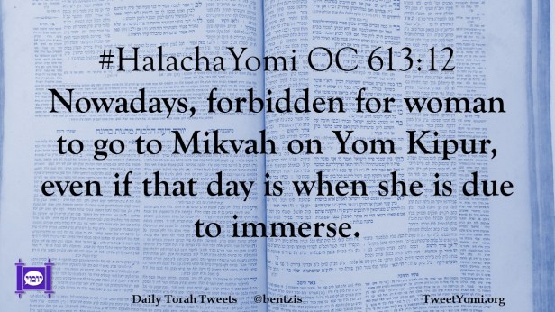 #HalachaYomi OC 613:12 Nowadays, forbidden for woman to go to Mikvah on Yom Kipur, even if that day is when she is due to immerse.