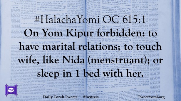 #HalachaYomi OC 615:1 On Yom Kipur forbidden: to have marital relations; to touch wife, like Nida (menstruant); or sleep in 1 bed with her.