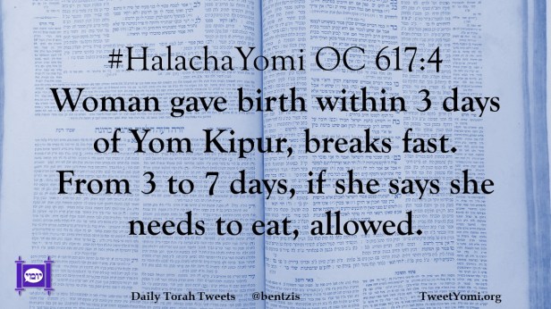 #HalachaYomi OC 617:4 Woman gave birth within 3 days of Yom Kipur, breaks fast. From 3 to 7 days, if she says she needs to eat, allowed.