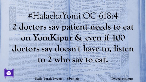 #HalachaYomi OC 618:4 2 doctors say patient needs to eat on YomKipur & even if 100 doctors say doesn’t have to, listen to 2 who say to eat.