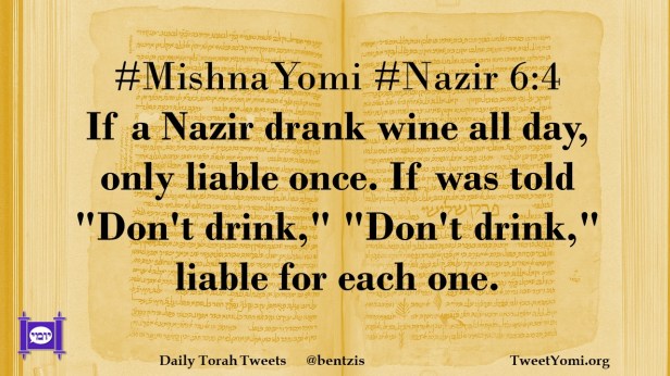 #MishnaYomi #Nazir 6:4 If a Nazir drank wine all day, only liable once. If was told “Don’t drink,” “Don’t drink,” liable for each one.