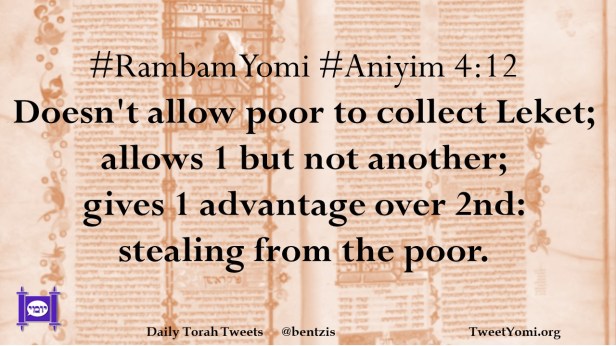 #RambamYomi #Aniyim 4:12 Doesn’t allow poor to collect Leket; allows 1 but not another; gives 1 advantage over 2nd: stealing from the poor.