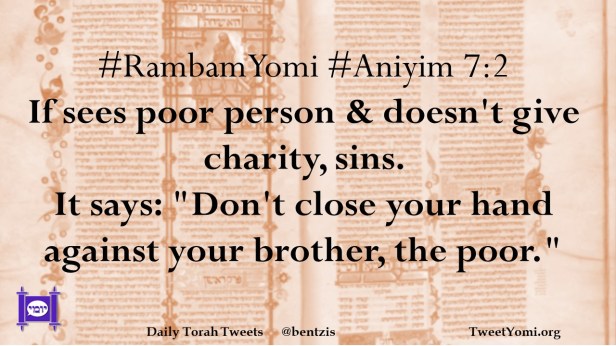 #RambamYomi #Aniyim 7:2 If sees poor person & doesn’t give charity, sins. It says: “Don’t close your hand against your brother, the poor.”