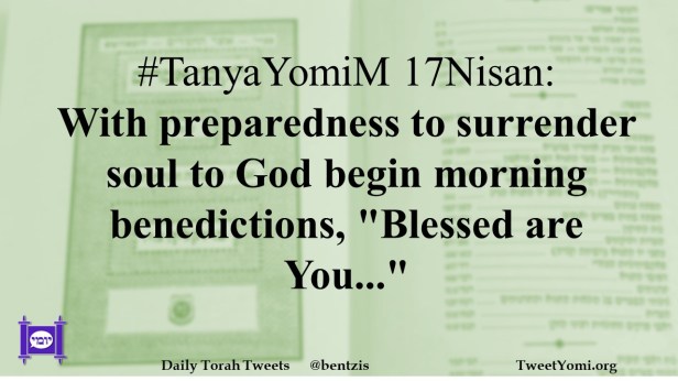 TanyaYomiM #TanyaYomiM 17Nisan Date: April 30, 2024Author: netanelspitz #TanyaYomiM 17Nisan: With preparedness to surrender soul to God begin morning benedictions, “Blessed are You…” Share this: Share on X (Opens in new window) X Share on Facebook (Opens in new window) Facebook Like Loading... Related