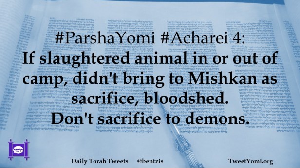 #ParshaYomi #Acharei 4: If slaughtered animal in or out of camp, didn’t bring to Mishkan as sacrifice, bloodshed. Don’t sacrifice to demons.