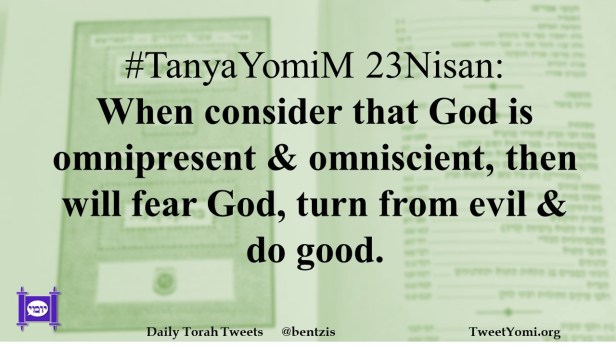 TanyaYomiM #TanyaYomiM 23Nisan Date: May 2, 2024Author: netanelspitz #TanyaYomiM 23Nisan: When consider that God is omnipresent & omniscient, then will fear God, turn from evil & do good. Share this: Share on X (Opens in new window) X Share on Facebook (Opens in new window) Facebook Like Loading... Related