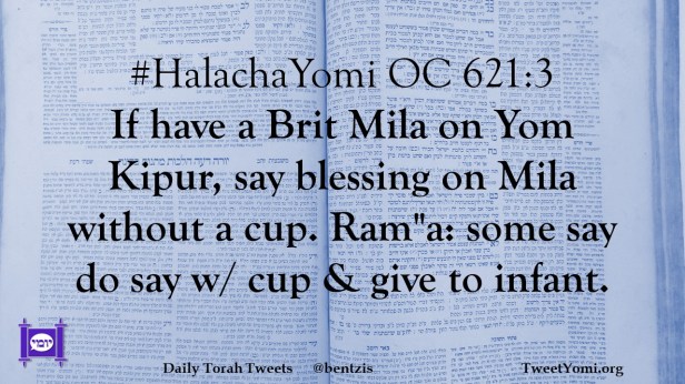 #HalachaYomi OC 621:3 If have a Brit Mila on Yom Kipur, say blessing on Mila without a cup. Ram”a: some say do say w/ cup & give to infant.