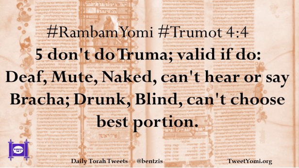 #RambamYomi #Trumot 4:4 5 don’t do Truma; valid if do: Deaf, Mute, Naked, can’t hear or say Bracha; Drunk, Blind, can’t choose best portion.