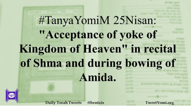 TanyaYomiM #TanyaYomiM 25Nisan Date: May 6, 2024Author: netanelspitz #TanyaYomiM 25Nisan: “Acceptance of yoke of Kingdom of Heaven” in recital of Shma and during bowing of Amida. Share this: Share on X (Opens in new window) X Share on Facebook (Opens in new window) Facebook Like Loading... Related