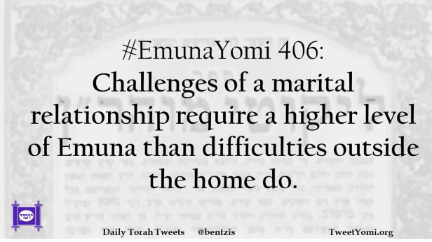 EmunaYomi #EmunaYomi 406 Date: May 9, 2024Author: netanelspitz #EmunaYomi 406: Challenges of a marital relationship require a higher level of Emuna than difficulties outside the home do. Share this: Share on X (Opens in new window) X Share on Facebook (Opens in new window) Facebook Like Loading... Related