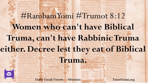 #RambamYomi #Trumot 8:12 Women who can’t have Biblical Truma, can’t have Rabbinic Truma either. Decree lest they eat of Biblical Truma.