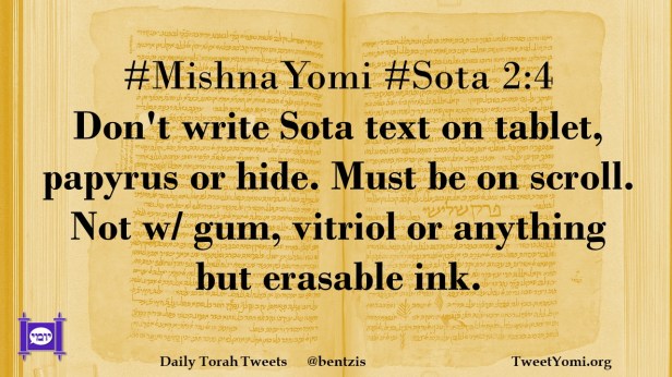 #MishnaYomi #Sota 2:4 Don’t write Sota text on tablet, papyrus or hide. Must be on scroll. Not w/ gum, vitriol or anything but erasable ink.