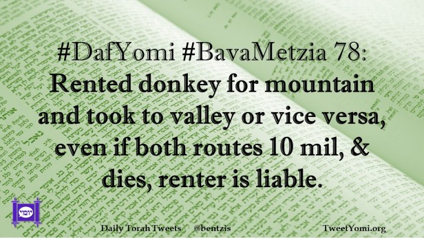 #DafYomi #BavaMetzia 78: Rented donkey for mountain and took to valley or vice versa, even if both routes 10 mil, & dies, renter is liable.