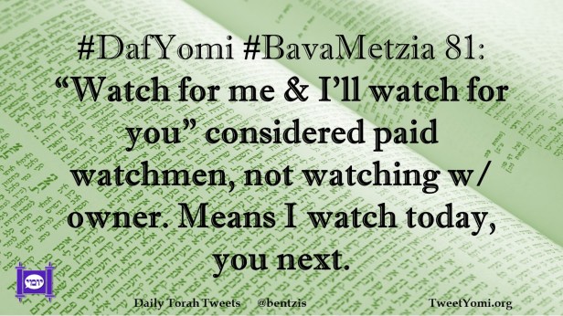 #DafYomi #BavaMetzia 81: “Watch for me & I’ll watch for you” considered paid watchmen, not watching w/ owner. Means I watch today, you next.