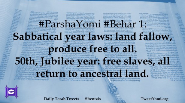 #ParshaYomi #Behar 1: Sabbatical year laws: land fallow, produce free to all. 50th, Jubilee year: free slaves, all return to ancestral land.