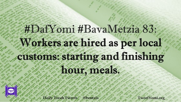 BavaMetzia, DafYomi #DafYomi #BavaMetzia 83 Date: May 21, 2024Author: netanelspitz #DafYomi #BavaMetzia 83: Workers are hired as per local customs: starting and finishing hour, meals. Share this: Share on X (Opens in new window) X Share on Facebook (Opens in new window) Facebook Like Loading... Related