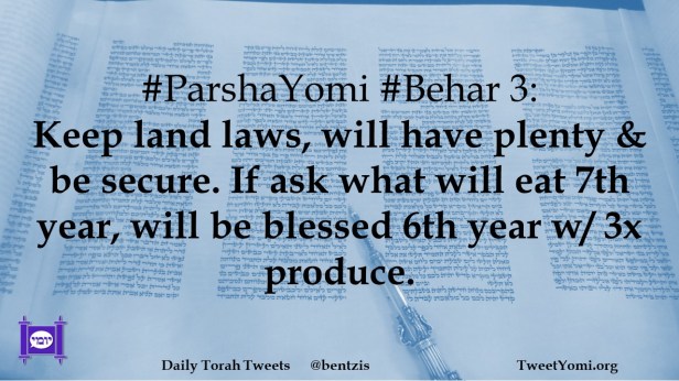 #ParshaYomi #Behar 3: Keep land laws, will have plenty & be secure. If ask what will eat 7th year, will be blessed 6th year w/ 3x produce.