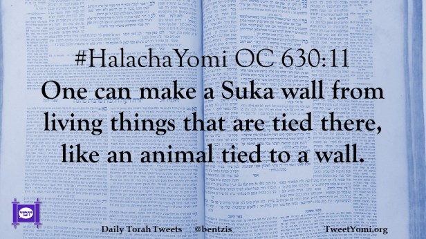HalachaYomi #HalachaYomi OC 630:11 Date: May 26, 2024Author: netanelspitz #HalachaYomi OC 630:11 One can make a Suka wall from living things that are tied there, like an animal tied to a wall. Share this: Share on X (Opens in new window) X Share on Facebook (Opens in new window) Facebook Like Loading... Related