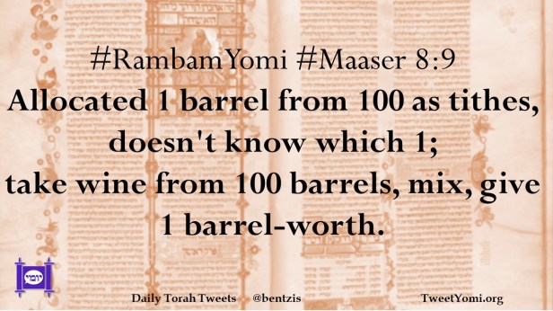 #RambamYomi #Maaser 8:9 Allocated 1 barrel from 100 as tithes, doesn’t know which 1; take wine from 100 barrels, mix, give 1 barrel-worth.