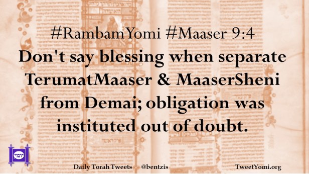 #RambamYomi #Maaser 9:4 Don’t say blessing when separate TerumatMaaser & MaaserSheni from Demai; obligation was instituted out of doubt.