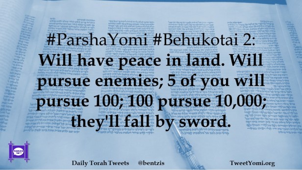 #ParshaYomi #Behukotai 2: Will have peace in land. Will pursue enemies; 5 of you will pursue 100; 100 pursue 10,000; they’ll fall by sword.