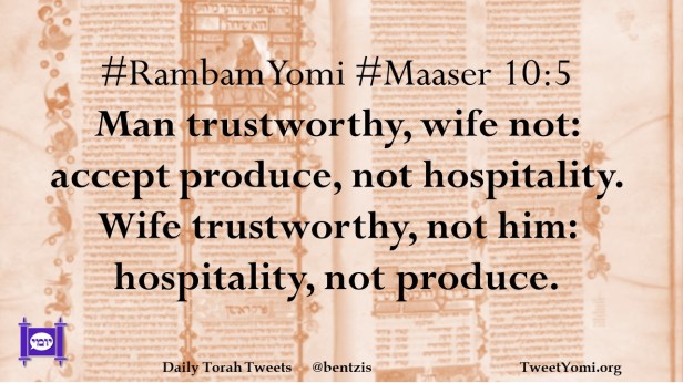 #RambamYomi #Maaser 10:5 Man trustworthy, wife not: accept produce, not hospitality. Wife trustworthy, not him: hospitality, not produce.