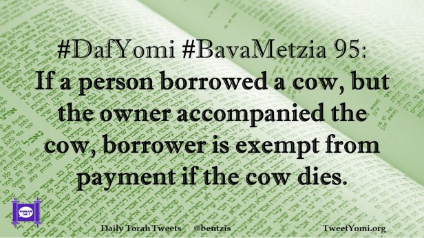 DafYomi #BavaMetzia 95: If a person borrowed a cow, but the owner accompanied the cow, borrower is exempt from payment if the cow dies.