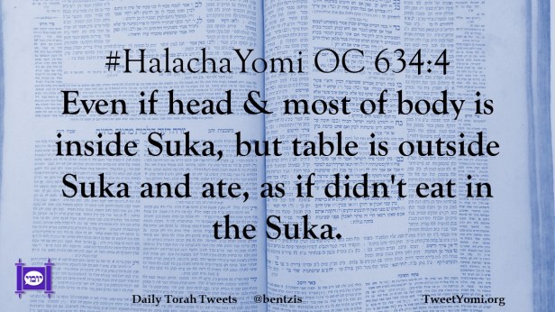 HalachaYomi OC 634:4 Even if head & most of body is inside Suka, but table is outside Suka and ate, as if didn’t eat in the Suka.