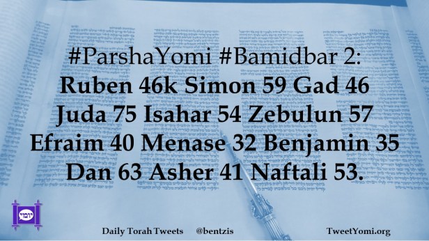 ParshaYomi #Bamidbar 2: Ruben 46k Simon 59 Gad 46 Juda 75 Isahar 54 Zebulun 57 Efraim 40 Menase 32 Benjamin 35 Dan 63 Asher 41 Naftali 53.