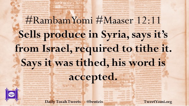 #RambamYomi #Maaser 12:11 Sells produce in Syria, says it’s from Israel, required to tithe it. Says it was tithed, his word is accepted.