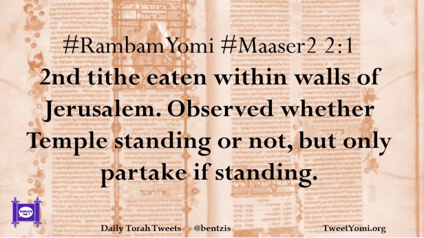 #RambamYomi #Maaser2 2:1 2nd tithe eaten within walls of Jerusalem. Observed whether Temple standing or not, but only partake if standing.