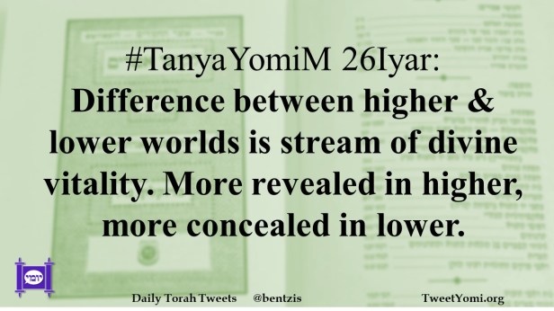 TanyaYomiM 26Iyar: Difference between higher & lower worlds is stream of divine vitality. More revealed in higher, more concealed in lower.