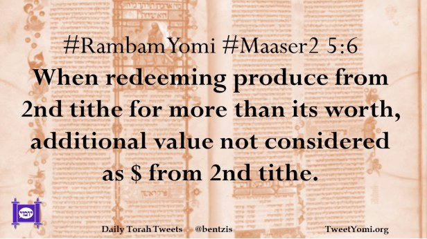 RambamYomi #Maaser2 5:6 When redeeming produce from 2nd tithe for more than its worth, additional value not considered as $ from 2nd tithe.