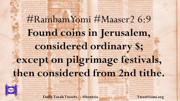 RambamYomi #Maaser2 6:9 Found coins in Jerusalem, considered ordinary $; except on pilgrimage festivals, then considered from 2nd tithe.