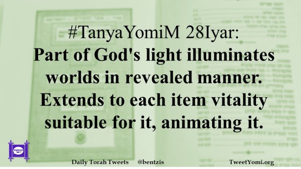TanyaYomiM 28Iyar: Part of God’s light illuminates worlds in revealed manner. Extends to each item vitality suitable for it, animating it.