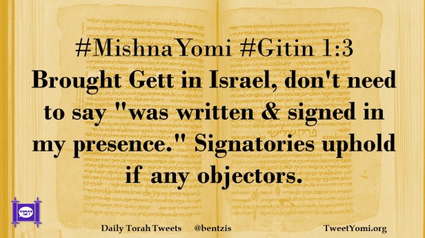 MishnaYomi #Gitin 1:3 Brought Gett in Israel, don’t need to say “was written & signed in my presence.” Signatories uphold if any objectors.