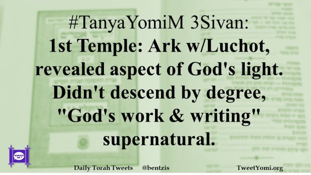 TanyaYomiM 3Sivan: 1st Temple: Ark w/Luchot, revealed aspect of God’s light. Didn’t descend by degree, “God’s work & writing” supernatural.