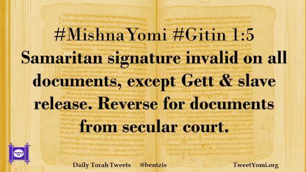 MishnaYomi #Gitin 1:5 Samaritan signature invalid on all documents, except Gett & slave release. Reverse for documents from secular court.